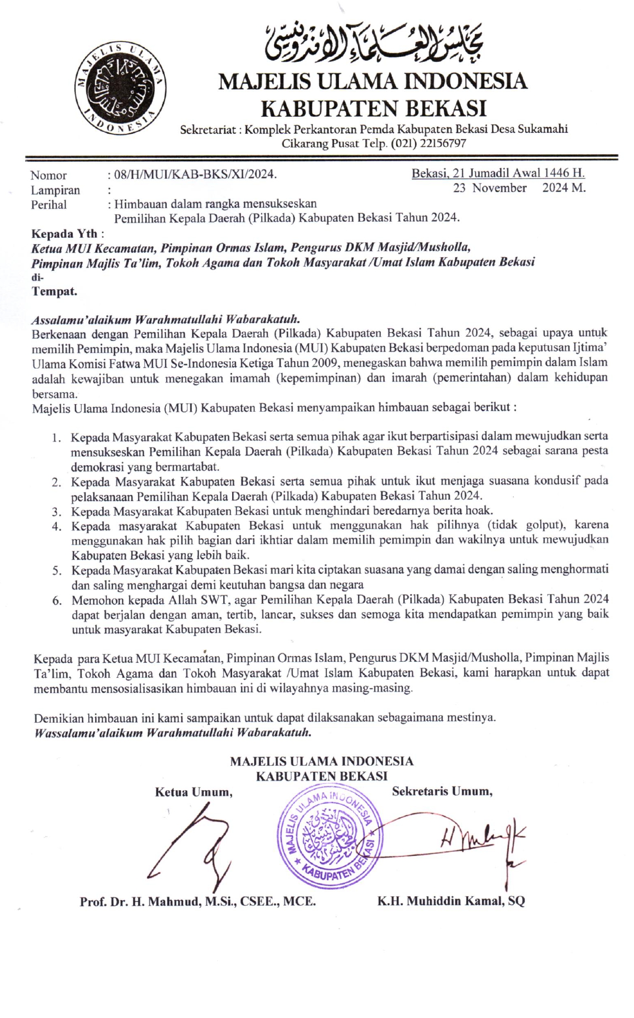 Cikarang Pusat – Majelis Ulama Indonesia (MUI) Kabupaten Bekasi telah menerbitkan himbauan penting dalam rangka mensukseskan Pemilihan Kepala Daerah (PILKADA) Kabupaten Bekasi tahun 2024. Himbauan ini secara resmi disampaikan kepada seluruh masyarakat melalui surat yang disebarkan kepada Ketua MUI di masing-masing kecamatan se-Kabupaten Bekasi.