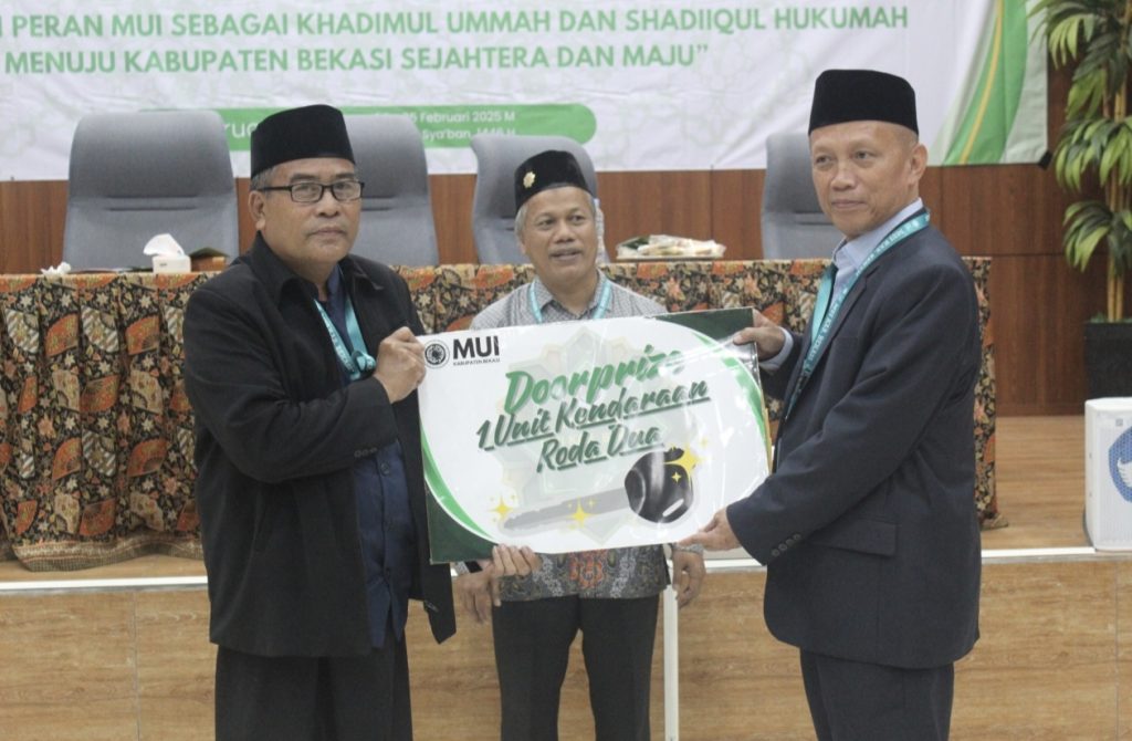Bekasi – Majelis Ulama Indonesia (MUI) Kabupaten Bekasi, Prof. Dr. KH. Mahmud M.Si., CSEE., MCE secara langsung menyerahkan hadiah berupa 1 unit sepeda motor kepada pemenang Doorprize Musyawarah Daerah (MUSDA) ke-10 , Ustadz Sahroni yang merupakan pengurus MUI Kecamatan Muara Gembong.